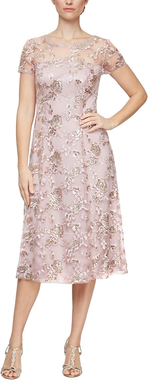 | Style Name | Tea Length Cap Sleeve Illusion Neckline Embroidered Lace Dress |